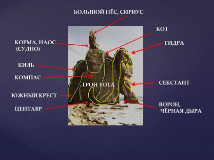 Большой Пёс стоит в лодке – созвездии Корма, под ним находится созвездие Кота (старое название созвездия у второго кольца Гидры), там же начинается абрис головы Тота по очертаниям созвездий Гидры (варана), Парус и Киль. Очертания трона Тота образуются звёздами отростка созвездия Центавр: