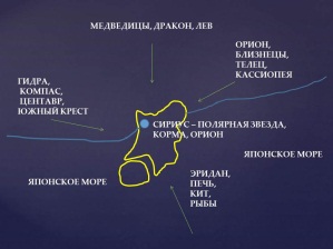 Три звезды, как знак Знамени Мира, находятся у стоп созвездия Близнецов. Так что, перед нами не просто скала Белая Церковь, стоящая на берегу Японского моря, а объёмная космическая карта тела, сотканного из звёзд и космической пыли, с трёх сторон. Ещё одна сторона осталась неизученной, она обращена к морю, но можно догадаться, какие звёзды там будут показаны (вид скалы Белая Церковь сверху, со спутника):