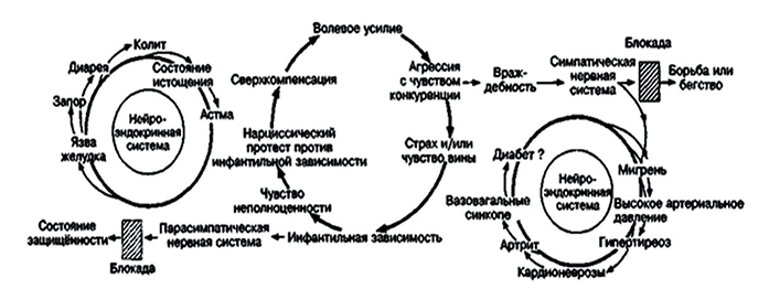 Александер объединил в схематическом изображении (рисунок 1) две основные установки («вступления в бой» и «отступления») с их нервным субстратом и исход этих тенденций в психосоматические заболевания, блокируемых внешними или внутренними причинами.