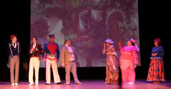 Спектакль «Женитьба», сцена представления женихов. Роли исполняют (слева-направо): Игорь Колосов, Филипп Соболенко, Артур Жуков, Данила Зольников, Инна Селиверстова, Надежда Шайденко и Людмила Майер.