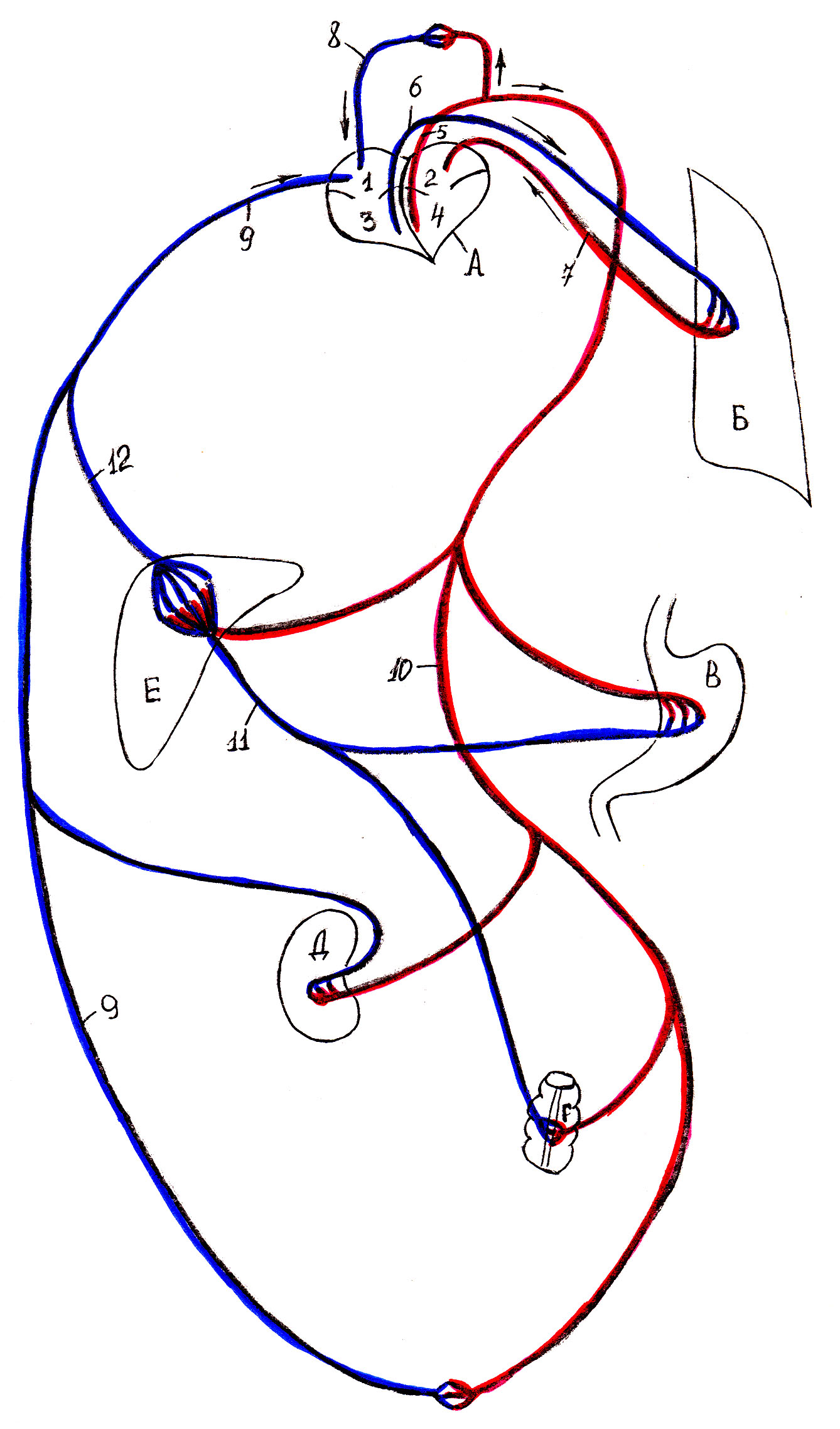 1 – правое предсердие, 2 – левое предсердие, 3 – правый желудочек, 4 – левый желудочек, 5 – дуга аорты, 6 – легочный ствол, 7 – легочная вена, 8 – верхняя полая вена, 9 – нижняя полая вена, 10 – нисходящая аорта, 11 – воротная вена печени, 12 – печеночная вена