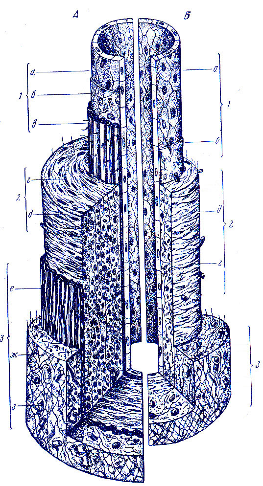 1 – внутренняя оболочка и в ней: а – эндотелий, б – подэндотелиальный слой; в – внутренняя эластическая мембрана; 2 – средняя оболочка и в ней: г – гладкие мышечные клетки, д – эластические волокна; 3 – наружная оболочка и в ней: е – наружная эластическая мембрана, ж – рыхлая соединительная ткань, з – кровеносные сосуды сосудов
