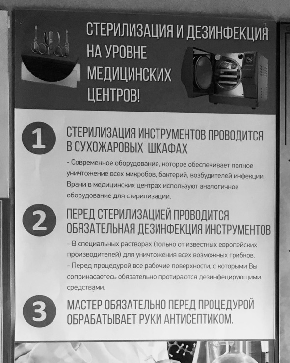На моём первом рабочем месте, на стене в кабинете, висел в пластиковой рамке плакат размера А1 с подробным описанием заботы руководства салона о своих гостях. Стенд с таким же текстом и похожим дизайном я заказала в типографии и в свою студию красоты. Он не только информирует клиента и вселяет чувство доверия ему, но и обязует мастера новичка не забывать об обязательных действиях дезинфекции и стерилизации.