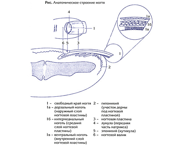Вентральный сетчатый слой дермы неподвижен, он зафиксирован связками к костной фаланге, а вот сосочковый слой с гребешками и бороздками играют важную роль рельсов, благодаря которым ногтевая пластина скользит вперед по своему ложу.