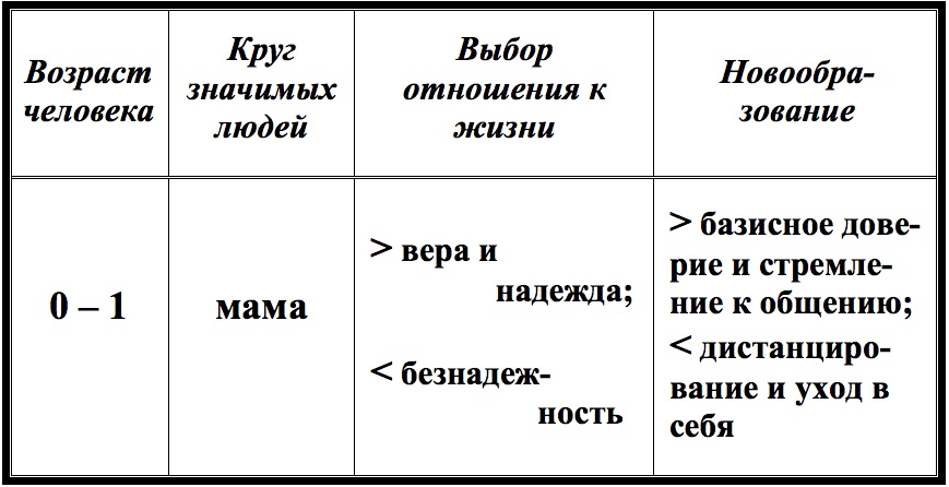 Для более наглядного изложения материала воспользуемся нижеследующей таблицей и будем заполнять ее в соответствии с периодами жизни человека.