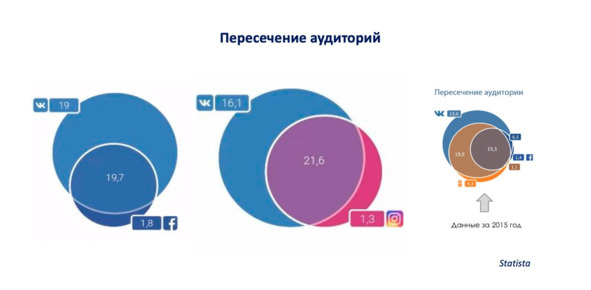 На рисунке вы видите, что из себя представляли аудитории социальных сетей на январь 2019 года и их пересечение, а также это пересечение по сравнению с 2013 годом.