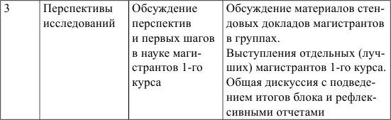 Структура и содержание четырех научных сессий, в которых принимает участие магистрант за два года обучения, отражена в таблицах 15–17.