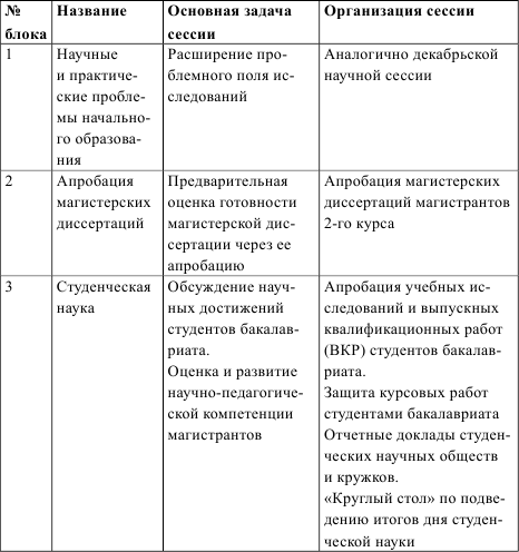 Научные сессии в магистерской программе – принципиально новый формат подготовки. Они представляют собой своеобразный цикл из четырех научно-практических конференций молодых ученых – магистрантов и проводятся на регулярной основе один раз в каждый семестр обучения. Все магистранты в обязательном порядке принимают участие в научных сессиях в качестве слушателей, дискутантов или докладчиков. Условием продуктивности этого вида процедур является постепенный (от 1-го к 4-му семестру) запланированный прирост научных «выходов» магистрантов. Рефлексивная основа научной деятельности обеспечивается не только содержанием, но и контингентом участников сессий (магистранты 1-го и 2-го курсов, студенты бакалавриата, аспиранты, научные и практические работники образования) – и позволяет магистранту «пройти» путь от начинающего до зрелого исследователя и научного руководителя студенческими исследованиями.