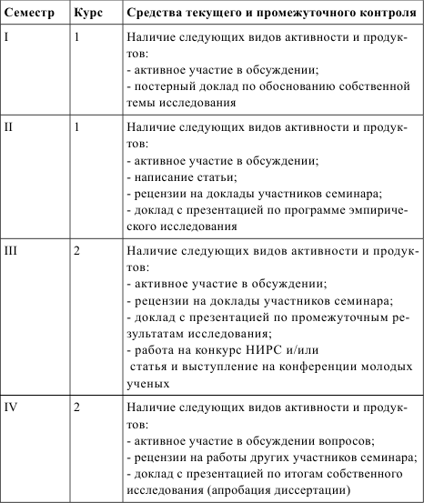 Текущая и промежуточная аттестации производятся на основании видов активности и продуктов магистрантов, приведенных в таблице 18. Преподаватель оценивает работу магистрантов в процессе научных сессий в формате «зачет/незачет», основываясь на показателях таблицы. При этом предусматривается разница в оценивании магистрантов 1-го и 2-го года обучения.