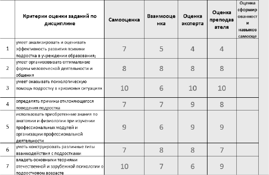 Таким образом, критериальное оценивание является динамичной процедурой самооценивания студентами учебно-познавательной деятельности, обеспечивающей его индивидуальный прогресс и мотивацию. Оно организует самостоятельную работу студентов в удобном для него темпе и исходя из его образовательных потребностей. Кроме того, такое оценивание обеспечивает преемственность и согласованность в работе преподавателей различных учебных дисциплин и практик и делает возможным компетентное участие в реализации образовательной программы супервизоров, школьных учителей и других заинтересованных лиц.