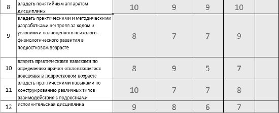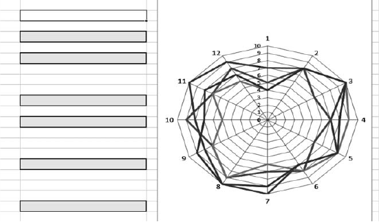 Оценка студента производится четырьмя лицами: самим студентом, преподавателем, другим студентом, экспертом (супервизором). Диаграмма позволяет наглядно увидеть совпадение или расхождение их оценок. Важно, что процедура оценивания осуществляется на протяжении изучения дисциплины несколько раз, что позволяет проследить динамику студента, а самому обучающемуся дифференцированно корректировать процесс формирования тех или иных умений и навыков.