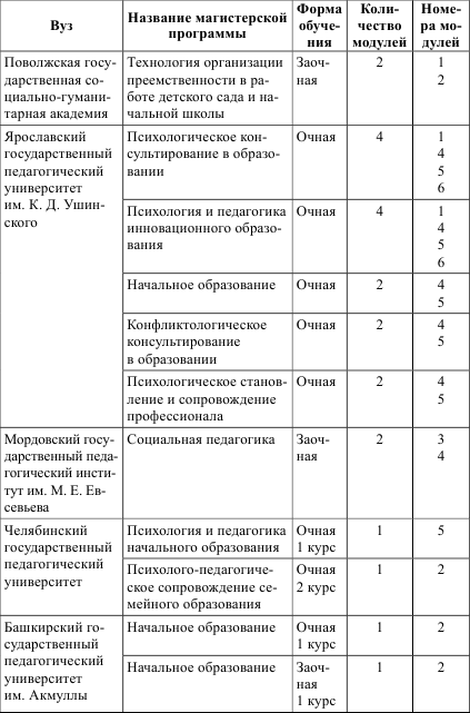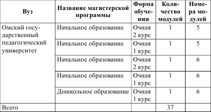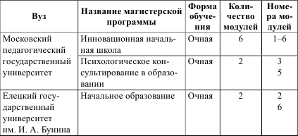 Обобщая, можно сказать, что ведущая идея модуляризации – возможность создания открытых и гибких структур образования и профессионального обучения. Так, из таблицы следует, что разработанные модули были использованы при построении магистерских программ в восьми вузах. При этом общее число модернизованных ОПОП магистратуры составило 19 программ (напомним, что в проекте было разработано всего 6 модулей). В таблице также указано количество модулей, использованных в модернизированных программах: максимальное количество модулей – 6 – реализовано в ОПОП «Инновационная начальная школа» МПГУ; девять ОПОП модернизированы с использованием только одного модуля. Например, для магистерской программы, несколько лет с успехом реализующейся в МПГУ, «Психологическое консультирование в образовании» актуальными явились два модуля: «Оценка и мониторинг основных образовательных результатов обучающихся в начальной школе» и «Индивидуализация и дифференциация учебно-воспитательной работы с детьми разных категорий», они логично «встроились» в ОПОП. Это позволило не просто обновить образовательную программу, но и реализовать новые форматы углубленной практики, внедрить сетевое взаимодействие.
