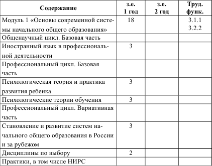 Модуль 1 «Основы современной системы начального общего образования». Идея модуля: введение студентов в проблематику начального образования, расширение и углубление представлений студентов о начальном образовании. Возможные дисциплины по выбору и практикумы: