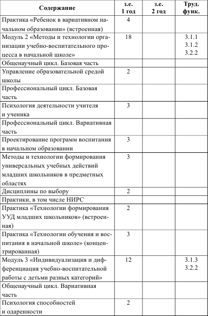 Модуль 2 «Методы и технологии организации учебно-воспитательного процесса в начальной школе». Магистральная цель данного модуля – приобретение обучающимися компетенций по адекватному использованию методов и технологий организации учебно-воспитательного процесса в начальной школе – определяет набор практикумов и дисциплин по выбору, которые раскрывают специфику технологий отдельных областей и сфер деятельности учителя: