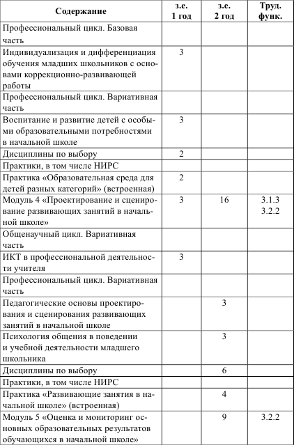 Дисциплина «Проектирование программ воспитания в начальном образовании». Программа учебной дисциплины реализуется в вариативной части модуля 2 «Методы и технологии организации учебно-воспитательного процесса в начальной школе». В процессе изучения дисциплины, сопряженной с практикой модуля, формируется трудовая функция: воспитательная деятельность. Принципиальными являются требования к входному уровню обучающихся, которые должны владеть методическими компетенциями в области организации воспитательной работы учителем класса.