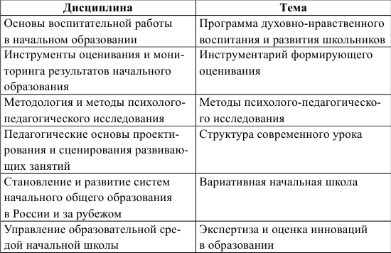 Тренинги в профессиональной подготовке магистра начальной школы представлены дисциплинами по выбору, относящимися как к психолого-педагогической части программы, так и методической, например: «Развитие творческого потенциала младших школьников».