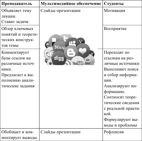 Так, для дисциплины «Управление образовательной средой начальной школы» эффективными являются лекции-визуализации с использованием сетевой информации: «Нормативные документы начального образования», «Локальные акты школ» и др. Сетевой контент подключается через сервисы закладок. Структура организации деятельности преподавателя и студентов на лекции приведена в таблице 12. Как видим, за счет привлечения реального сетевого контента через, например, сервисы закладок, происходит существенное расширение деятельностной активности студентов, обеспечение обратной связи, возможности рефлексивного осмысления ими теоретического материала.