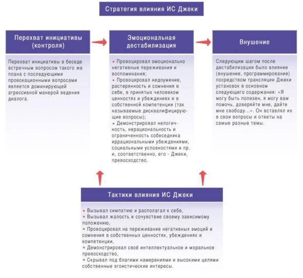 На протяжении всей экспертизы и в каждом отдельно взятом эпизоде общения Джеки действовал согласно одной и той же стратегии: перехват инициативы (контроля) встречными вопросами – эмоциональная дестабилизация собеседника провокационными интеракциями – внушение определённых, желательных для него установок (в основном такого типа: «я могу вам быть полезен, могу вам помочь, доверяйте мне, пожалейте меня, дайте мне свободу»).