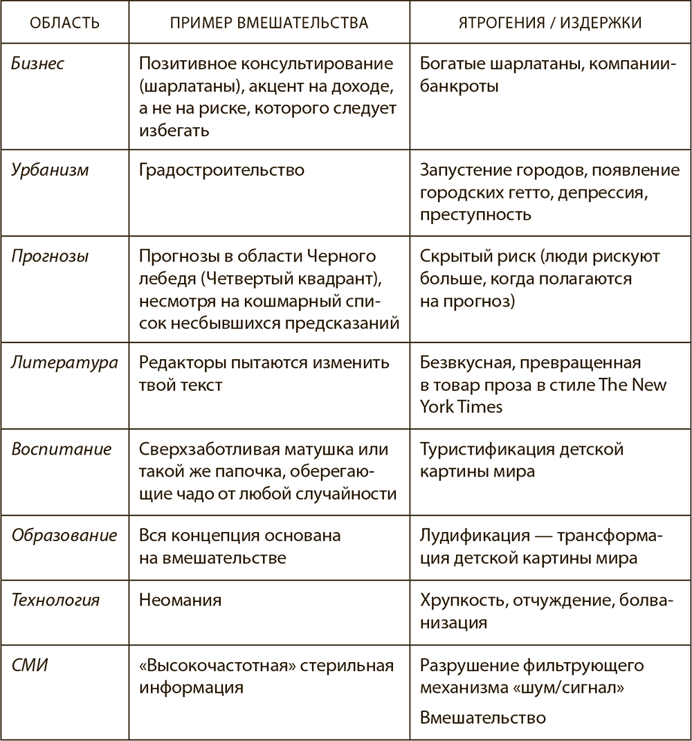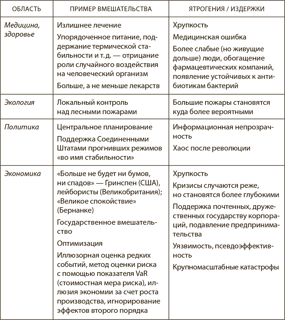 Таблица 3 дает представление о попытках «исправить ситуацию» в разных областях – и о том, какими последствиями чреваты эти попытки. Не забывайте очевидное: во всех случаях мы имеем дело с отрицанием антихрупкости.