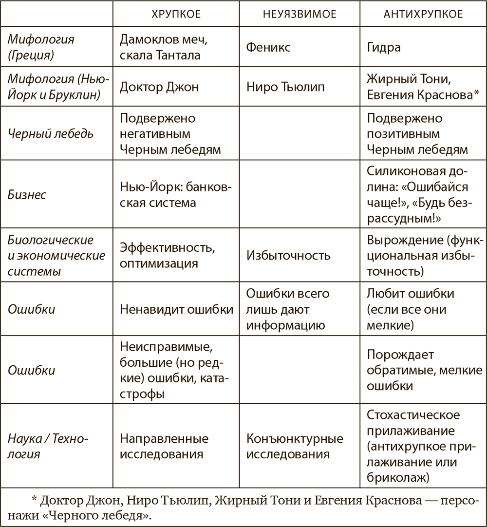 Чтобы удостовериться в том, что эта концепция нам чужда, повторите эксперимент: попросите людей на следующем деловом собрании, пикнике или сходке перед демонстрацией протеста назвать антоним слова «хрупкость» (не забывайте уточнять, что имеется в виду полная противоположность этому понятию, нечто с обратными свойствами и противоположной реакцией на стресс). Скорее всего, кроме слова «неуязвимое» вы услышите следующее: «то, что не ломается», «твердое», «крепкое», «эластичное», «сильное» и слова с компонентами «-стойкое», «-упорное», «-защитное» («ветрозащитное», «огнеупорное», «водостойкое») – если, конечно, опрашиваемые не слышали об этой книге. Люди ошибаются – и не одни только люди: целые области знаний путают одно с другим; эту же ошибку повторяют все словари синонимов и антонимов, которые я смог найти.