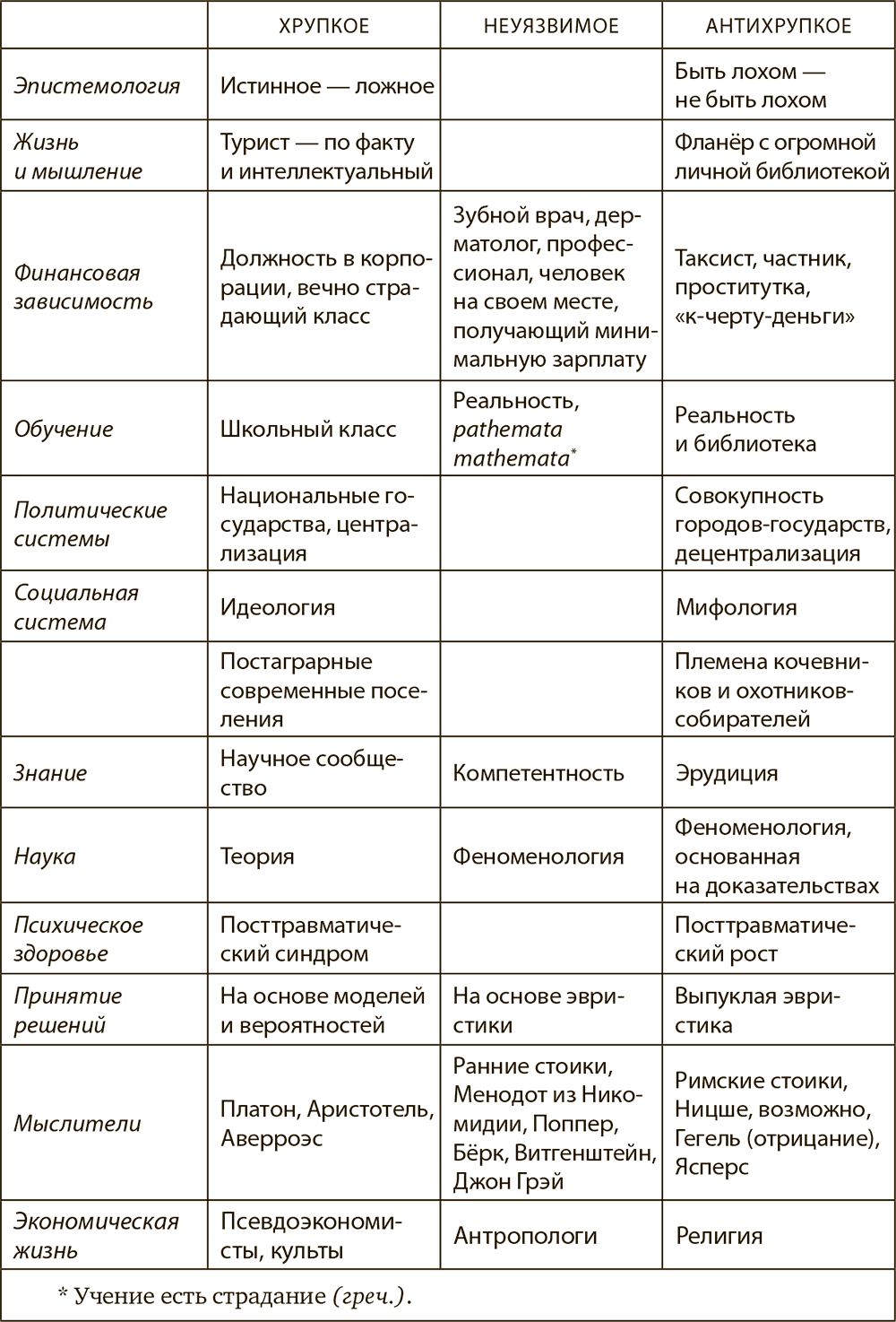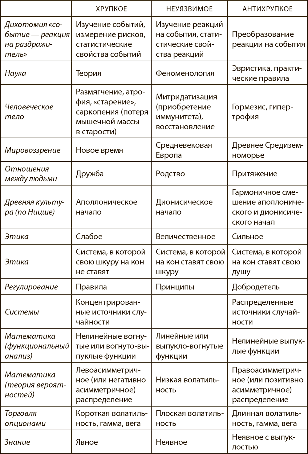 Золотая неуязвимость: категория «неуязвимое» в среднем столбце не равна аристотелевской «золотой середине» (сплошь и рядом неверно именуемой «золотым сечением»), как, например, щедрость – золотая середина между расточительством и скупостью. «Неуязвимое» может быть такой серединой, а может и не быть. В общем случае предпочтительна антихрупкость, но не всегда, и бывает, что антихрупкость обходится дорого, чрезвычайно дорого. Но всегда предпочитать антихрупкости неуязвимость неверно – как говорил Ницше, «дорого искупается – быть бессмертным: за это умираешь не раз живьем»[11].