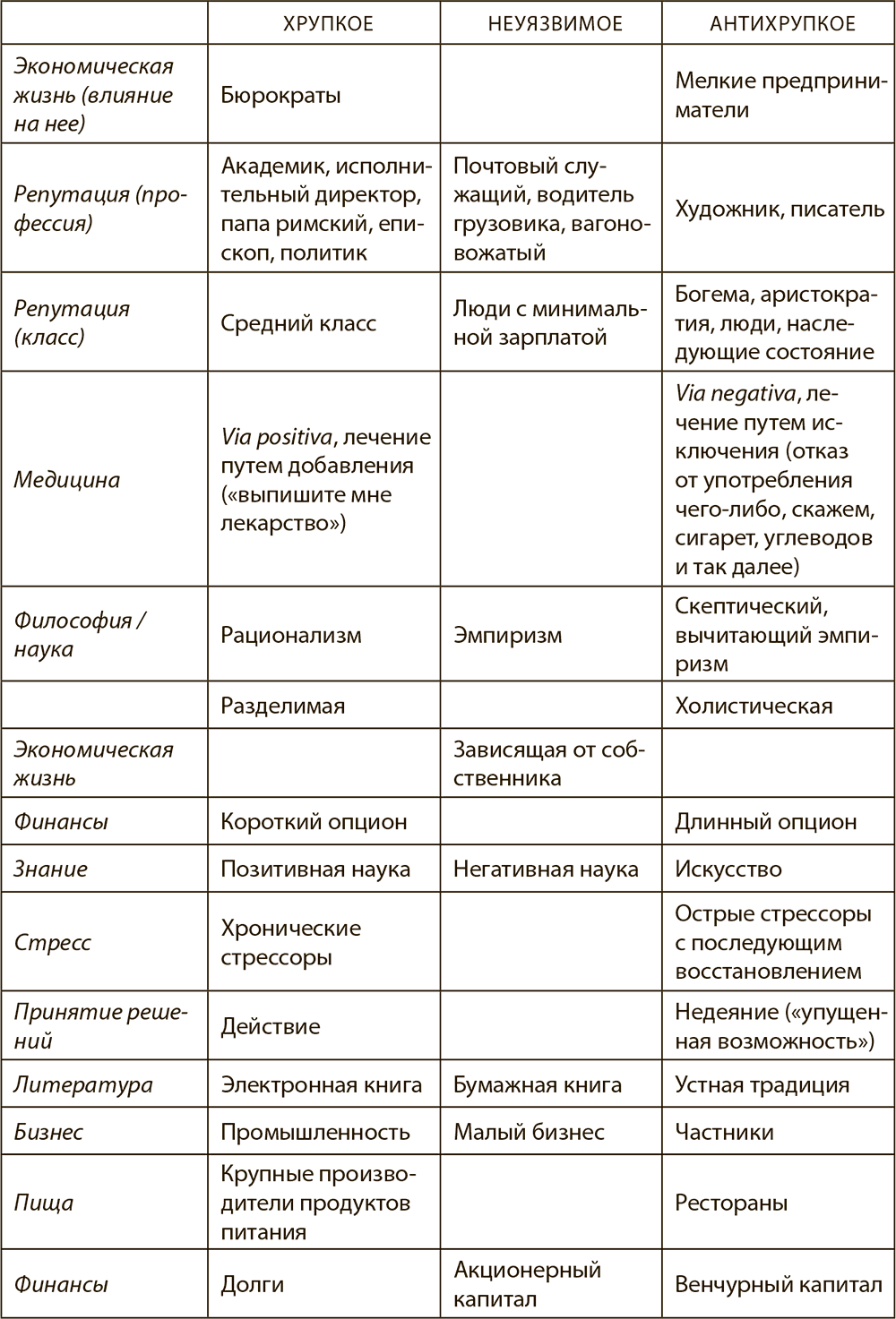 Заинтригованный новым словом читатель может ожидать от него слишком многого. Понятие «антихрупкость» чуть туманно и ограничено специфическими категориями вреда и переменчивости, а также определенным видом реакции на раздражители, но точно так же дело обстоит и с понятием «хрупкость». В конкретной ситуации антихрупкость относительна. Боксер может быть неуязвимым, крепким, если говорить о его физическом состоянии, и набираться опыта от схватки к схватке, но при этом он запросто может быть хрупким на уровне эмоций – и плакать, потому что его бросит девушка. Ваша бабушка может (или могла), совсем наоборот, быть хрупкой телесно, но сильной духовно. У меня перед глазами яркий эпизод гражданской войны в Ливане: сухонькая старушка, вдова (она была в черном), набрасывается на вражеских ополченцев за то, что они во время битвы разбили ее окно. Ополченцы наставляют на нее оружие; одной пули хватило бы, чтобы ее остановить, однако вдова напугала и устрашила их настолько, что они не решаются выстрелить. Эта женщина – противоположность нашего боксера: хрупкая физически, но отнюдь не хрупкая в душе.