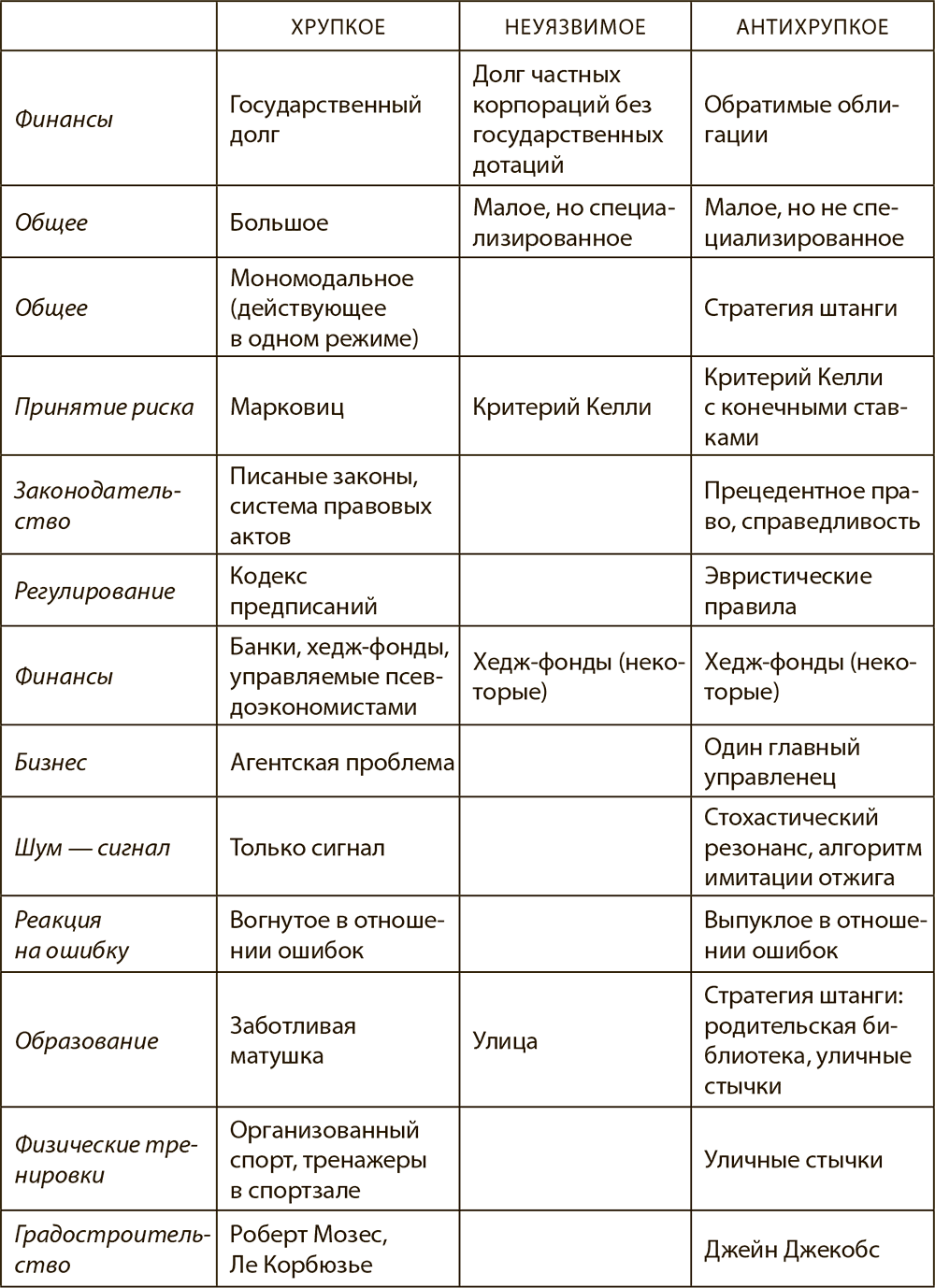 ХРУПКОЕ НЕУЯЗВИМОЕ АНТИХРУПКОЕВспомните: хрупкое хочет спокойствия, антихрупкое развивается в условиях беспорядка, а неуязвимому попросту все равно. Читателю предлагается просмотреть Триаду, чтобы понять, как идеи этой книги можно применять в разных областях жизни. А именно: когда вы рассматриваете объект или действие, связанные с какой-то темой, ваша задача – решить, в какую категорию Триады их можно поместить и что сделать для того, чтобы они стали менее хрупкими. Так, централизованное национальное государство однозначно попадает в левый столбец Триады, в категорию «хрупкое», а децентрализованная система городов-государств – в правый столбец, «антихрупкое». Придавая стране свойства системы городов-государств, мы можем избежать нежелательной хрупкости большого государства. Другой пример: ошибки. В категории «хрупкое» (слева) ошибки редки и, когда кто-то их совершает, влекут за собой ужасные последствия, а значит, неисправимы; в категории «антихрупкое» (справа) ошибки мелки и неопасны, вполне исправимы и быстро преодолимы. Все это также дает пищу для размышлений: система, которая развивается методом прилаживания, проб и ошибок, будет обладать свойствами антихрупкости. Если вы хотите обрести антихрупкость, заставьте себя «любить ошибки» (см. столбец справа от «ненавидеть ошибки»), чтобы ваши ошибки стали многочисленны и незначительны. Мы называем этот подход «стратегией штанги».