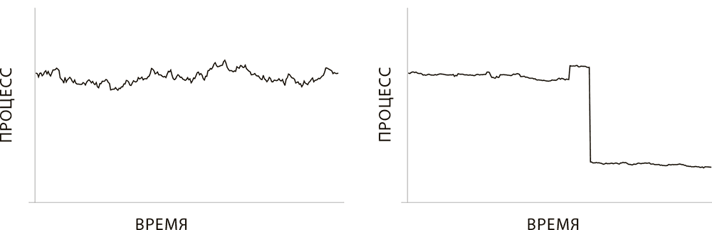 Рис. 3. Шум в самоуправлениях или распределенные колебания на ливанских базарах (первый график) в сравнении с централизованными – или управляемыми людьми – системами (второй график); или, аналогично, доход таксиста (первый) и доход наемного работника (второй). Второй график меняется ступенчато, от одного Черного лебедя к другому. Чрезмерное вмешательство в плавные процессы или процессы саморегулирования ведет к тому, что система одного типа, Среднестан, превращается в систему другого типа, Крайнестан. Этот принцип распространяется на все виды систем с ограниченной переменчивостью, такие как здоровье, политика, экономика, даже чье-либо настроение с прозаком или без. Точно так же Силиконовая долина, которую развивают предприниматели (первый график), отличается от банковской системы (второй график).