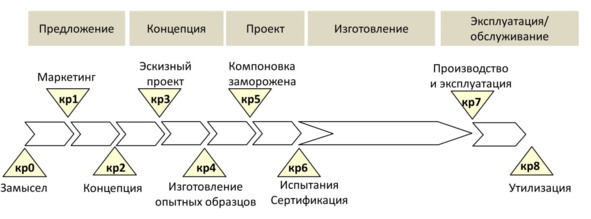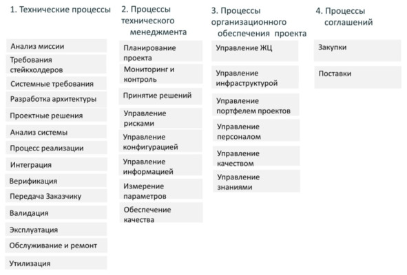 Управление жизненным циклом системы включает все действия для выполнения программы или проекта в различных фазах, разделенных точками принятия ключевых решений или контрольными рубежами (КР). В стандарте «Процессы жизненного цикла систем» ISO 15288:2015 (ГОСТ Р 57193—2016) перечислены 30 базовых процессов жизненного цикла систем, рис. 2.