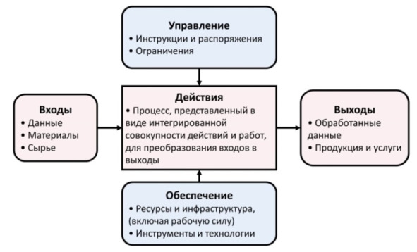 Типовое описание процессов жизненного цикла включает стандартные блоки компонентов. Каждый процесс состоит из входа, действия и выхода, дополненных функциями управления и обеспечения, рис. 3.