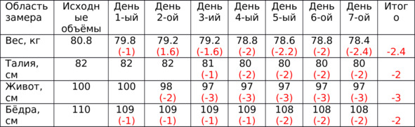 Вы уже обратили внимание что замеры я фиксирую по нарастающей, и в дальнейшем, в таблице объёмов исходные замеры будут соответствовать исходным замерам 1-го дня режима, а не первого дня каждой недели. Так легче видеть к чему пришла в каждый конктретный день.