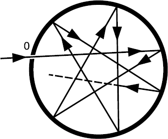 Самой распространенной моделью черного тела, которую приводят в пример школьникам, является сфера с внутренней зеркальной или черно-сажевой поверхностью и дырочкой, как на рисунке. Луч света, залетев в дырочку, попадает в ловушку и поглощается сажей или начинает бесконечно отражаться от стенок, потому что вероятность вырваться обратно у него очень мала.