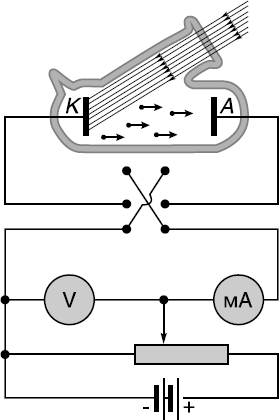 Световой поток вышибает электроны из катода лампы, и под действием электрического поля они устремляются к аноду, замыкая цепь.