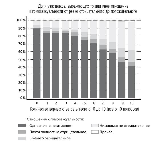 Он провел сопоставление IQ, вычисленного по быстрому тесту, с терпимостью по отношению к одной из самых ярких и вызывающих аномалий – гомосексуальным отношениям. И выяснил, что зависимость между толерантностью и умом прямо пропорциональная. Иначе говоря, чем больше в человеке гомофобии, чем более отрицательное у него отношение к геям, тем он глупее.