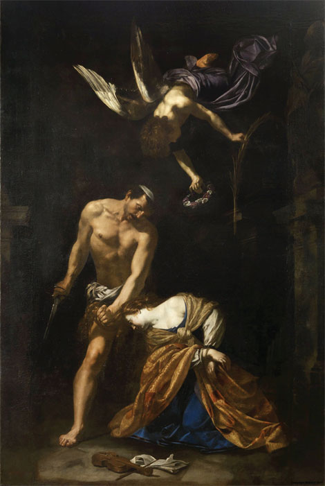 В картине «Казнь святой Цецилии» Орацио Риминальди[19] собрал все ключевые моменты истории: мускулистый палач с обнаженным торсом держит девушку за волосы, собираясь отсечь голову мечом, у ее ног лежит брошенная скрипка и нотная тетрадь, а над Цецилией парит ангел с венком из лилий и роз в одной руке и пальмовой ветвью в другой.