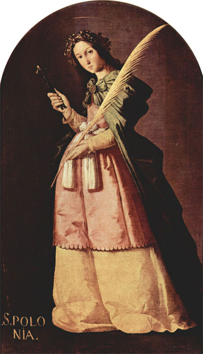 Позднее художники часто писали Аполлонию в виде юной девы с пальмовой ветвью мученицы и клещами, в которых зажат зуб. Наиболее известные изображения принадлежат Эрколе де Роберти[24], Рафаэлю[25] (рисунок 1501–1502 гг.) и Франсиско де Сурбарану (святая Аполлония в его цикле «Святые жены»).