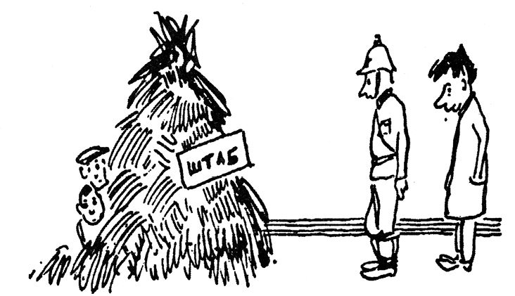 Милиционер, увидев на «стоге сена» надпись «Штаб», деловито спросил: