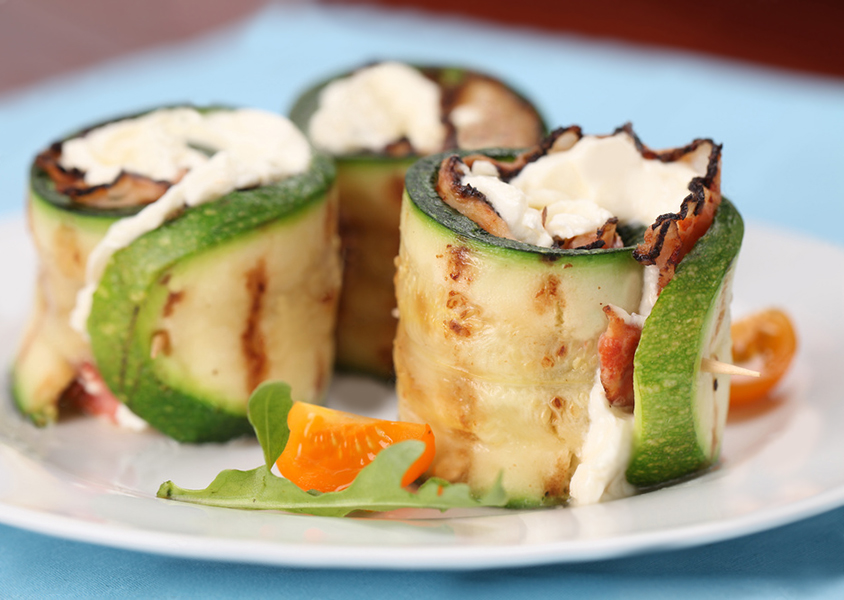 На остывшую пластинку кабачка уложить пластинку бекона. На край положить брусочек сыра и завернуть его в рулетик.