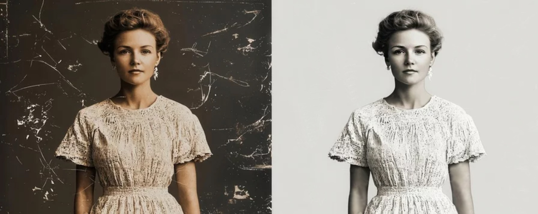 Фотография сканируется и при помощи инструментов ретуши в растровом редакторе «восстанавливается»: убирается пыль, грязь (муар), мутность и трещинки, меняется фон. Иногда черно-белой фотографии придают естественные цветные оттенки, или наоборот, цветную фотографию делают под стиль черно-белой, в оттенках серого и черного цвета. См. рис. 8.