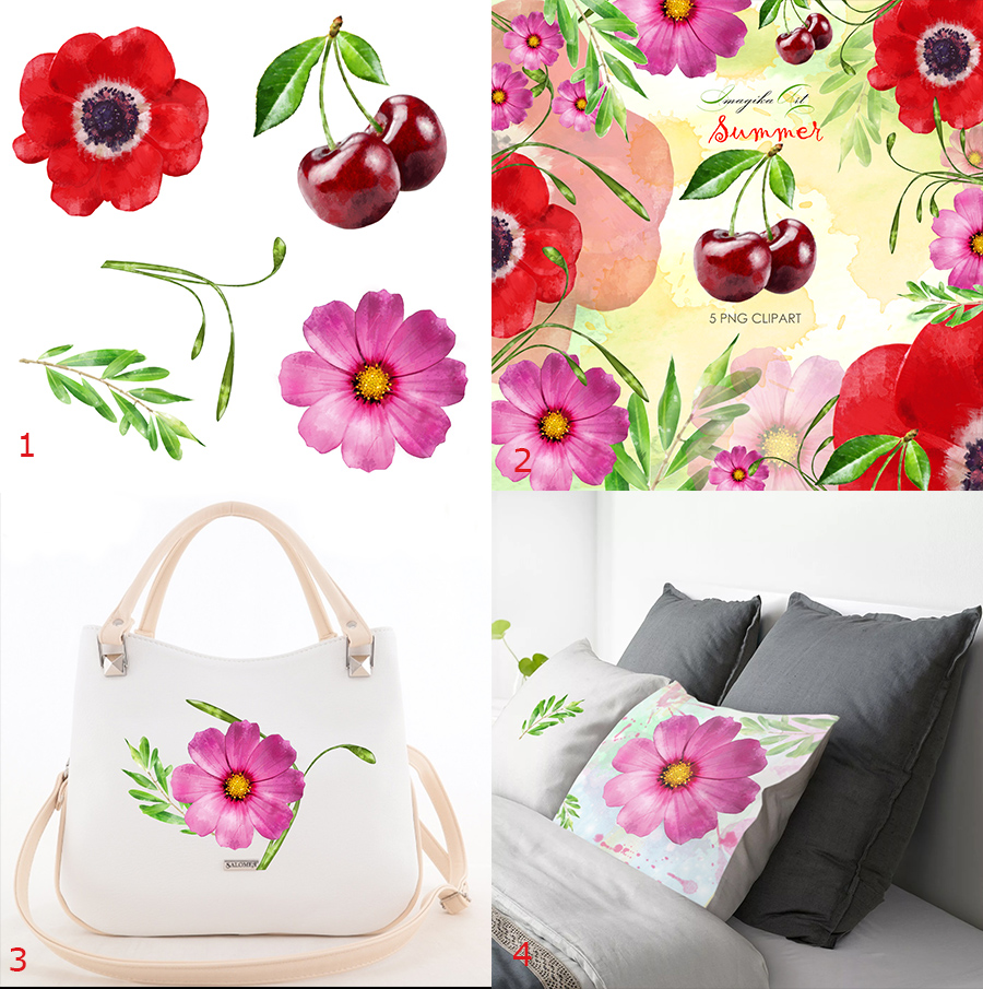 Рис. 7. Летний клипарт и его расположение на мокапах: сумке, подушке (клипарт создан Ириной Никулиной)