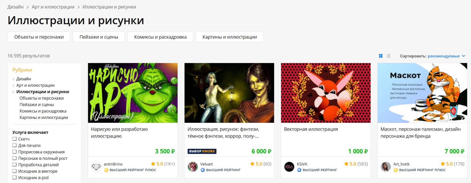 Рис. 10. Фрилансеры на сайте предлагают иллюстрации
