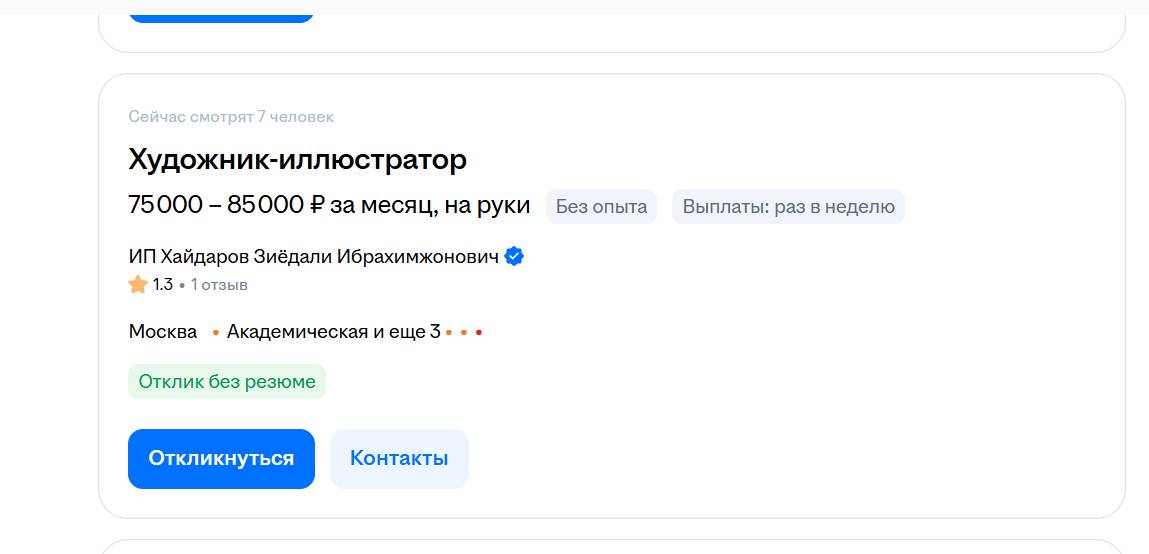 Рис. 11. Скриншот с сайта работы, иллюстратор без опыта (2025 г).