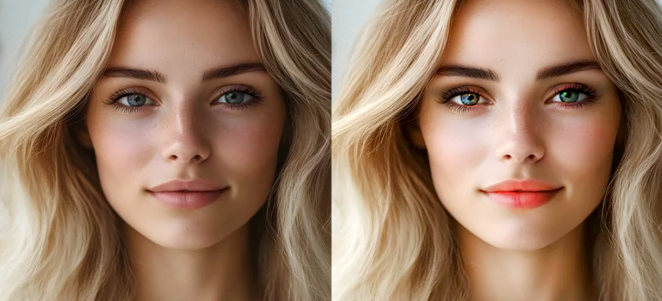 Иногда нужно перекрасить цвет глаз или волос. Для этого зрачки или волосы выделяются инструментами выделения, сохраняются в отдельный слой (функция «слой через копирование») и к этим слоям применяются команды тоновой и цветовой коррекции, эффекты. Так легко можно перекрасить любой предмет на фотографии.