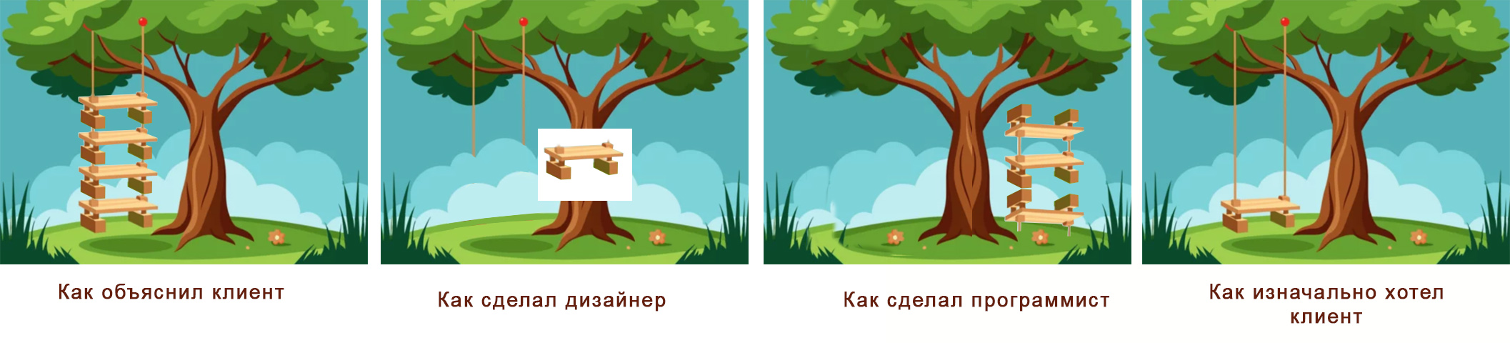 Клиент пытается на словах объяснить, что он хочет, дизайнер и программист понимают по своему и в результате получается совсем не тот сайт, который нужен клиенту. Возмущенный клиент предъявляет претензии разработчикам, но те ссылаются на невнятное ТЗ и требуют дополнительной оплаты за переделку сайта. К сожалению, это обычная ситуация в теме разработки сайтов, когда нет ТЗ или оно составлено безграмотно. Посмотрите рис. 2, что бывает при отсутствии четкого ТЗ.