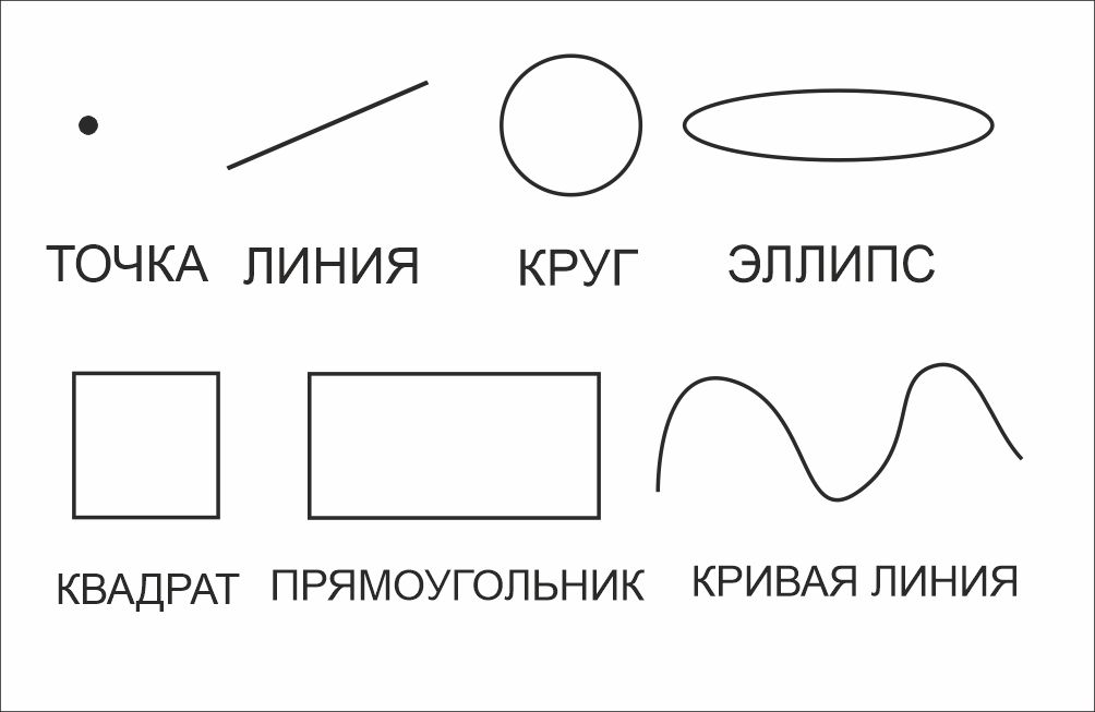 – Геометрические фигуры, такие как: точка, круг, эллипс, прямоугольник, квадрат и др.