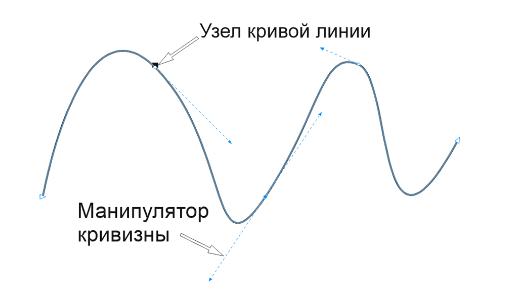 Положение начальной и конечной точки кривой называются «узлы кривой». Так же используется термин «кривизна» линии. Кривизна – изогнутость кривой линии между двумя узлами. Кривизна определяется двумя параметрами кривой, которые представлены отрезками, выходящими из узлов.