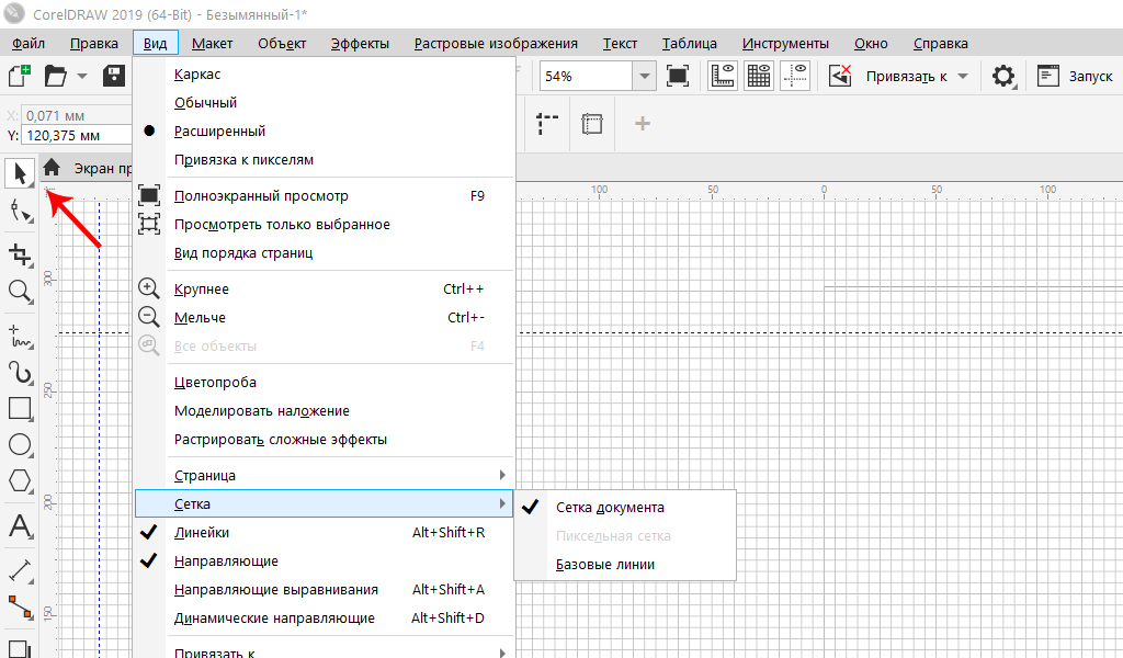 Этот инструмент находится в самом верху панели инструментов, имеет пиктограмму «черная стрелочка». Этим инструментом выделяются объекты щелчком левой клавиши при нажатом инструменте.