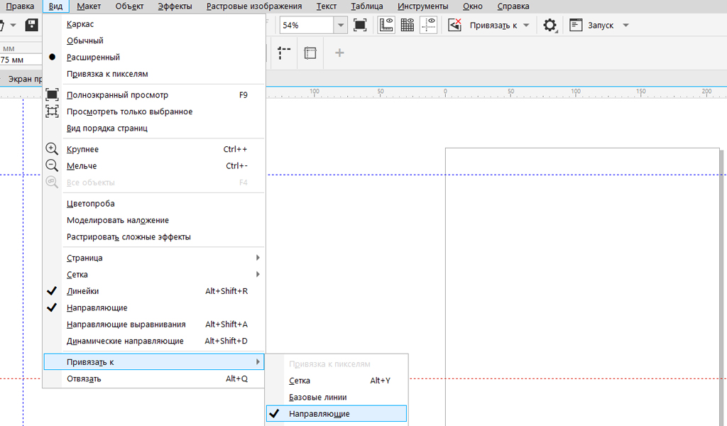 В меню «Вид» щелчком мышки откройте команду «Привязать» и поставьте галочку «Направляющие». Тогда векторные объекты будут подтягиваться к направляющим линиям и легко по ним выравниваться. Можно выстроить объекты по углам сетки, базовым линиям или привязать объекты к объектам. Но, как правило, такая привязка создает больше путаницы, чем пользы, поэтому для новичков считаю достаточной привязку только к направляющим линиям. Смотрите рис. 15.