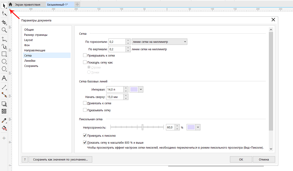 Познакомимся с сеткой. В первую очередь, нам нужно настроить размер ячеек. На рис.14 черная стрелка указывает в угол пересечения линеек (слева вверху). Щелкните там правой клавишей мыши, выберите «Установки сетки», щелкните левой клавишей мышки и в открывшемся окне выберите слово «Сетка». Здесь находятся опции сетки. См. рис.17.