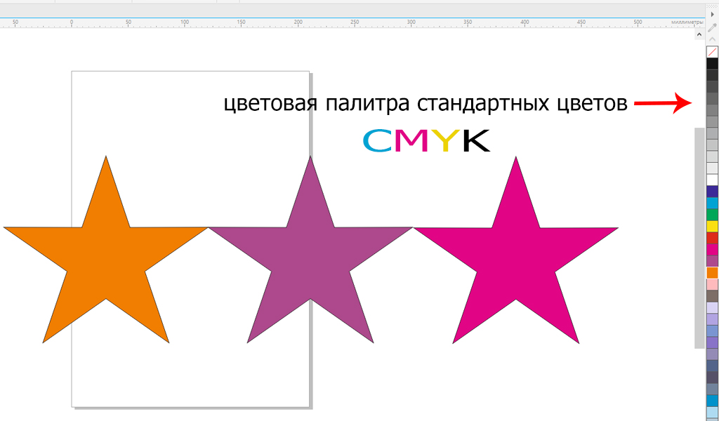 На рисунке 18 в правой части рабочего окна вы видите цветовую палитру программы CorelDRAW, на ней собраны наиболее популярные для печати цвета. По умолчанию это CMYK-палитра, она предназначена для печати полиграфических макетов.
